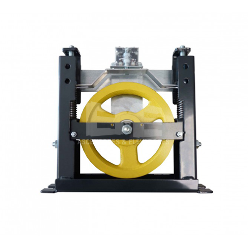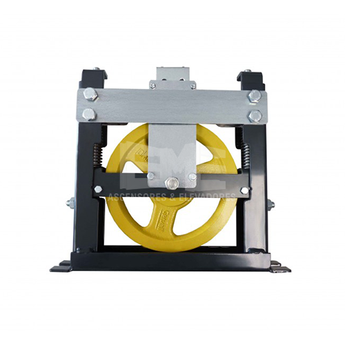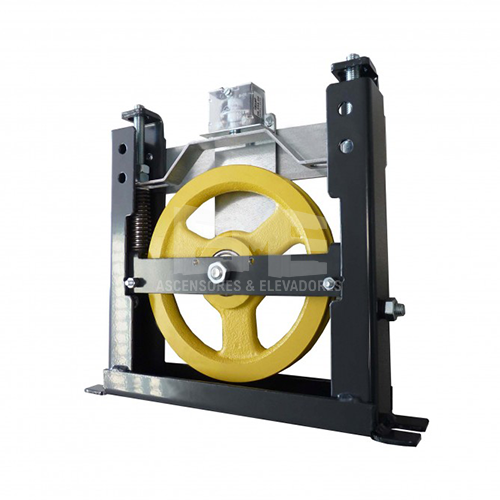Polea tensora de diámetro 200mm. Diseñada para el accionamiento de paracaídas en subida y bajada, con fijación al fondo del foso.